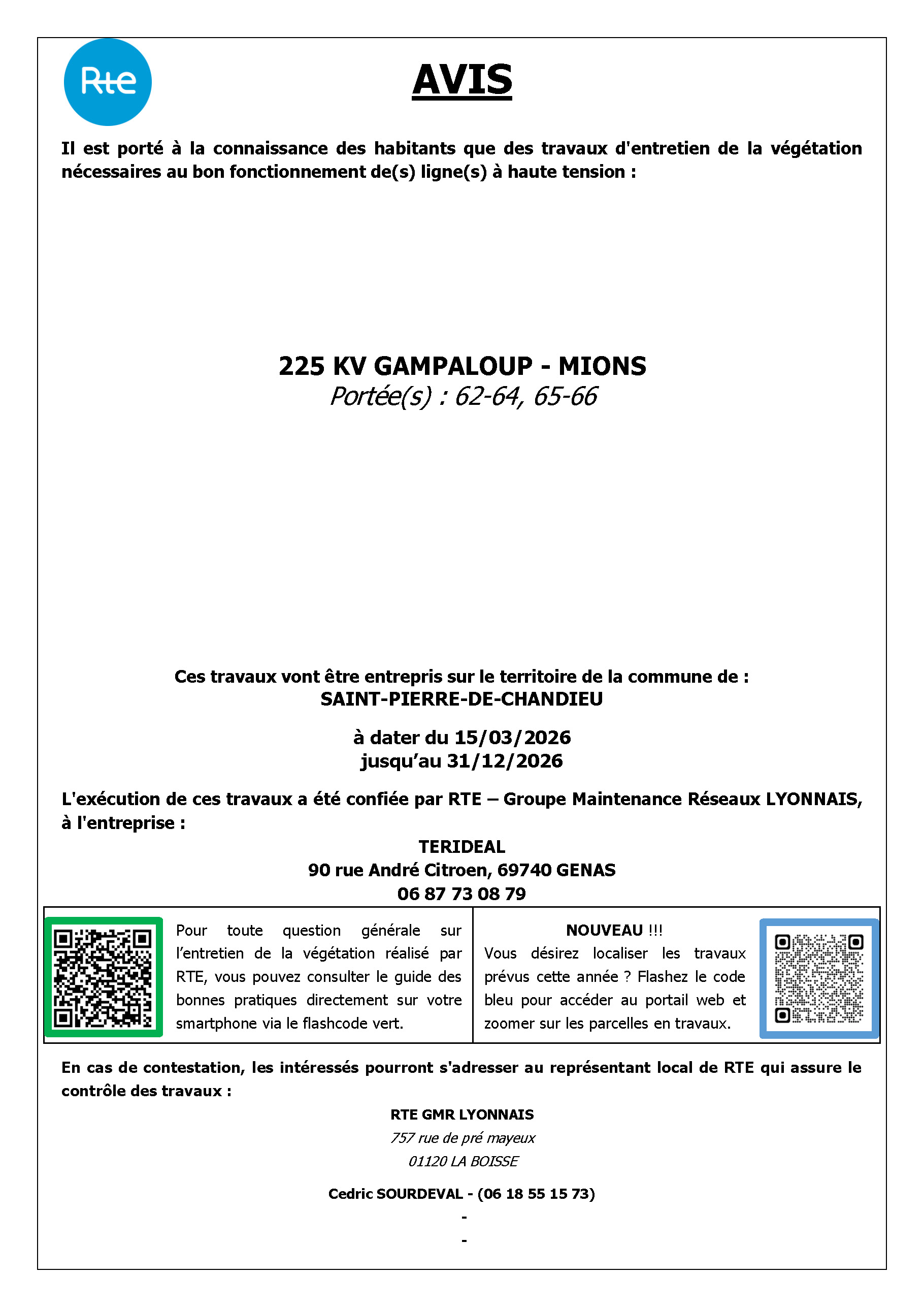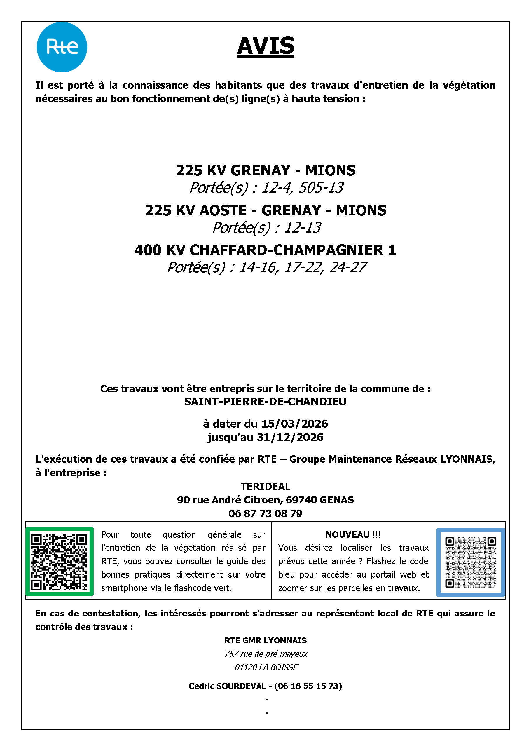 Conformément aux dispositions de l'article 12 de la Loi du 15 juin 1906 sur les distributions d'énergie et de l'arrêté du 17 mai 2001 relatif aux conditions techniques auxquelles doivent satisfaire les lignes de transport et de distribution électrique, des travaux d'élagage et d'abattage vont être entrepris prochainement sur le territoire de votre commune, afin d'assurer le bon fonctionnement des lignes hautes tension mais également la sécurité des personnes aux abords de ces ouvrages.