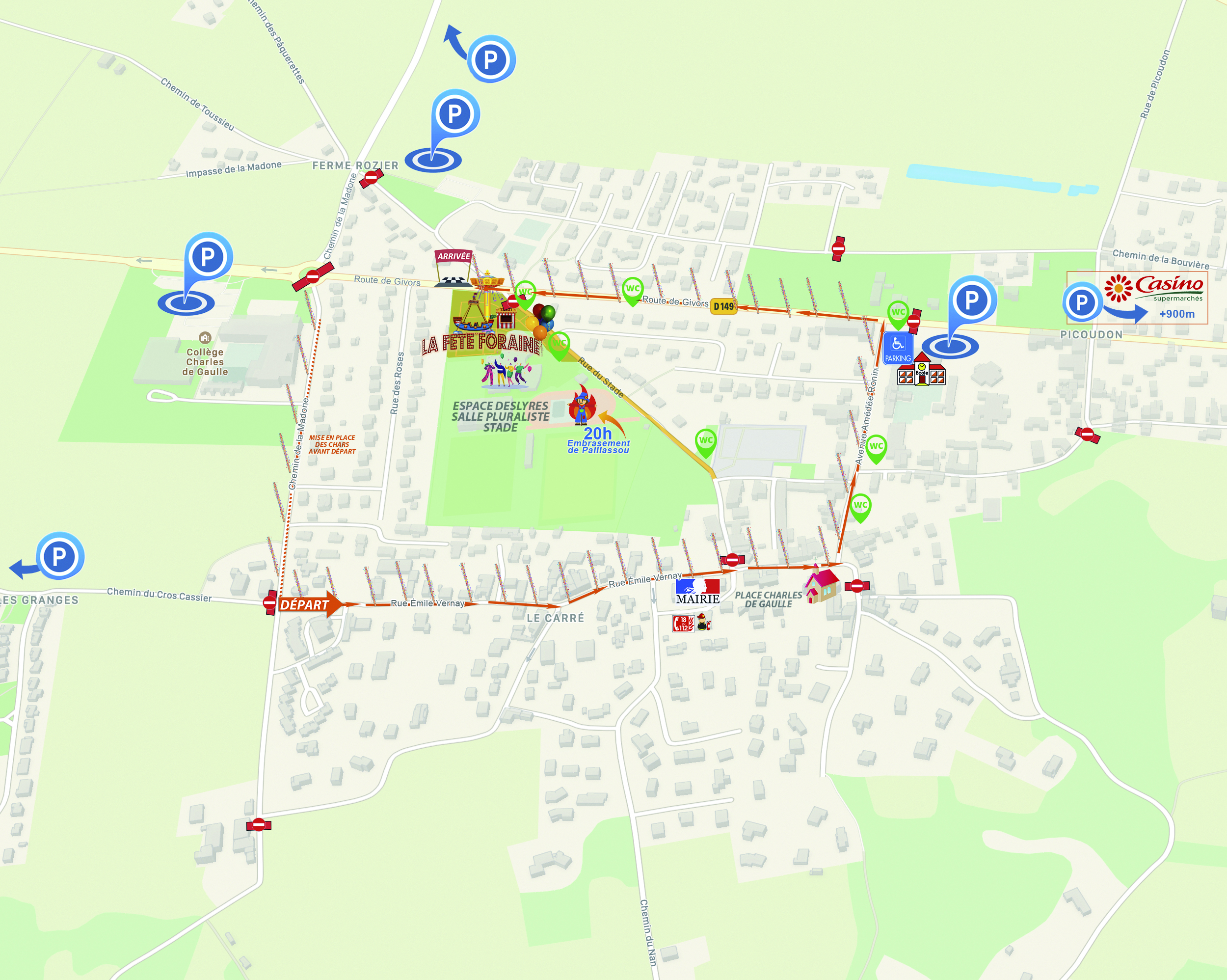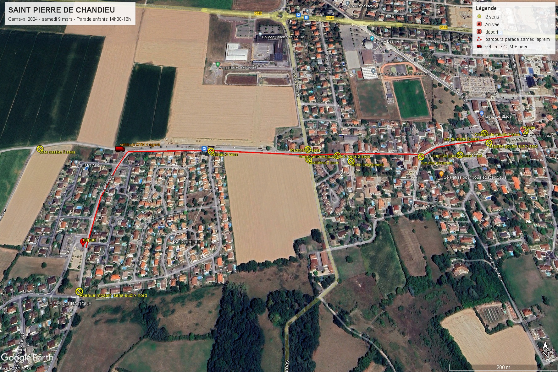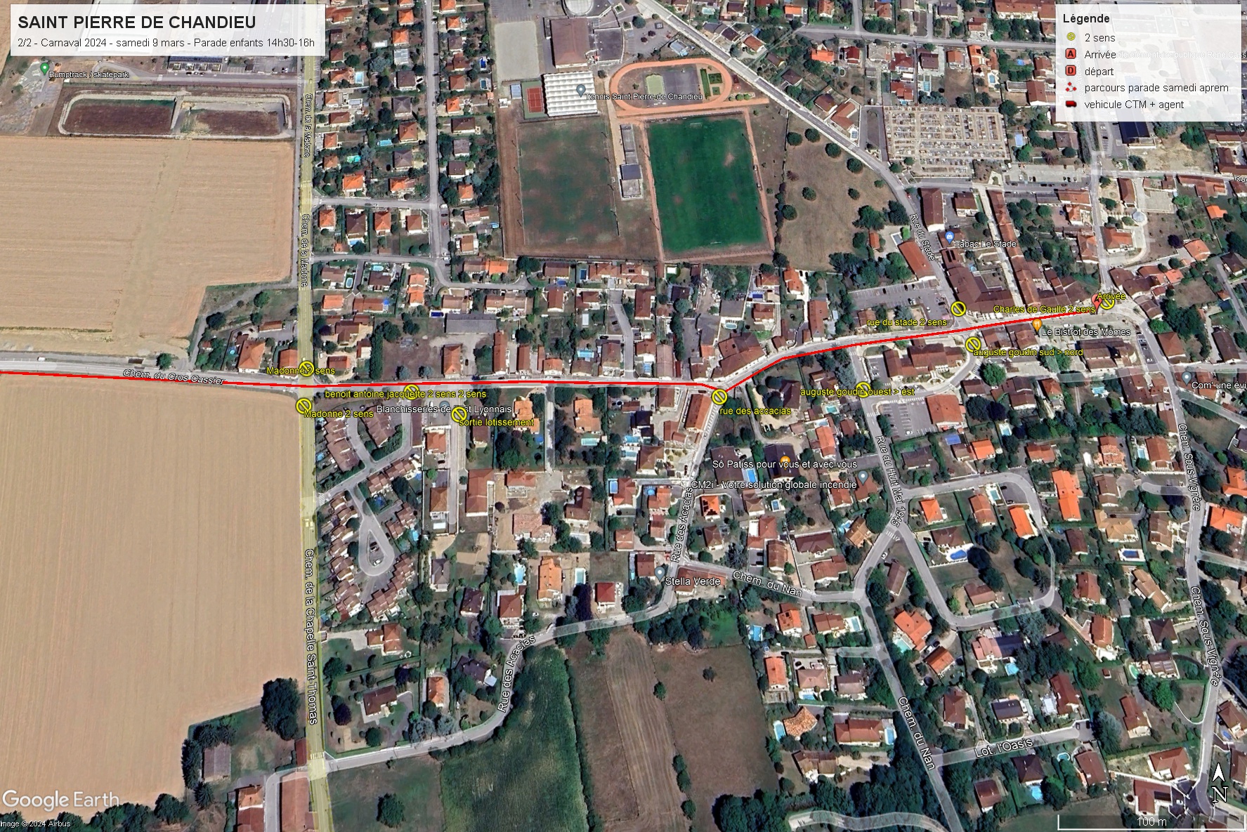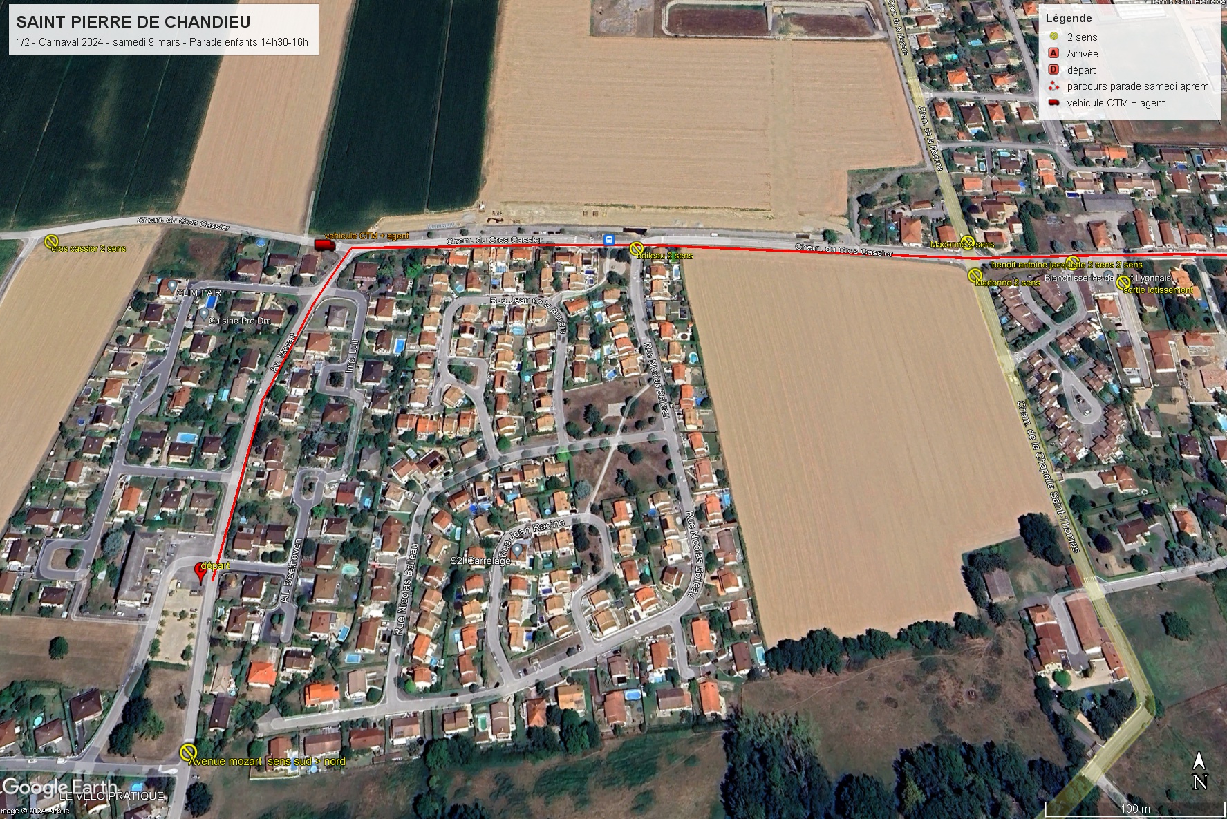Mise en place Chemin de la Madone (sens nord/sud) entre les jardins de Colette et le collège. → Rue Emile Vernay → Place Charles de Gaulle → Rue Amédée Ronin → Route de Givors.